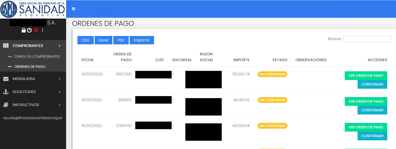Es condición necesaria que todas las Ordenes de Pago emitidas esten conformadas por el prestador, adjuntando el recibo de pago en forma digital a fin de no entorpecer el proceso de pago de próximas facturas.